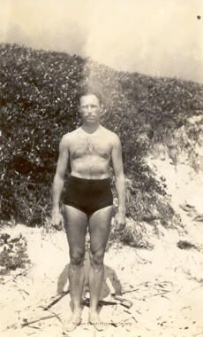 In this black and white photograph a man (Ralph Sterner) stands on a sand dune facing the camera. He is wearing a bathing suit and is bare chested. There is vegetation growing on the dune behind him. The photograph has a light streak going from his face to the top of the picture.Collection