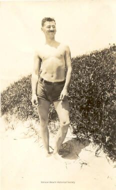 In this black and white photograph (discolored with age) a man poses on a sand dune with vegetation in the background. He assumes a casual stance and is gazing to the right of the camera with eyes almost closed and a self conscious smile on his face. He has a mustache and is wearing trunks.Collection