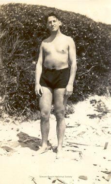 A man with a soft stomach and sturdy legs stands on the beach in front of a large hedge. He is wearing black swim trunks. He has short dark hair and his arms hang at his sides. His expression is noncommittal.Collection