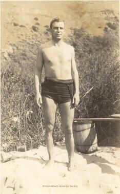 A man stands in the dunes in front of some thistles with his feet slightly spread and his shoulders back, arms at his sides. He is in black swim trunks and his hair is medium color. There is a wooden keg behind him which is supporting a board,Collection