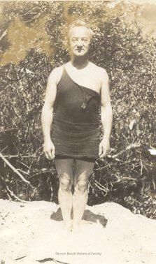Tiv Krelling (See 1999-317M) stands in the dunes in front of brambles with his feet together and arms straight at his sides. He is a hefty man with short, light hair and prominent nose. He is not smiling. He is wearing a swimsuit similar to Ivan's (see 1999-341). It is dark with one shoulder strap undone and hanging over his chest.Collection