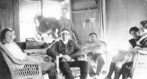 This black and white photograph is similar to the previous (#1999-344-01) except Olive isn't in it. Hattie is sitting in a wicker chair at the left. The three men are at the center of the picture in front of the Victrola, and at the right is a man sitting on a chair with a woman sitting on his lap. Everyone is looking at the camera except the girl on the lap who is looking across at Hattie.Collection