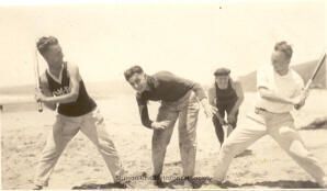 In this black and white photograph (brown with age) two men face each other, each wielding a baseball bat. The man on teh left wears trousers and a tank top: the one on the left wears trousers and a t shirt. There is a man between them, bent at the waist as if to get his eye level lower. Another man a little farther back is crouched at the same eye level. Everyone is on the beach with the bay in the left back ground and the hills tapering down from the right.Collection