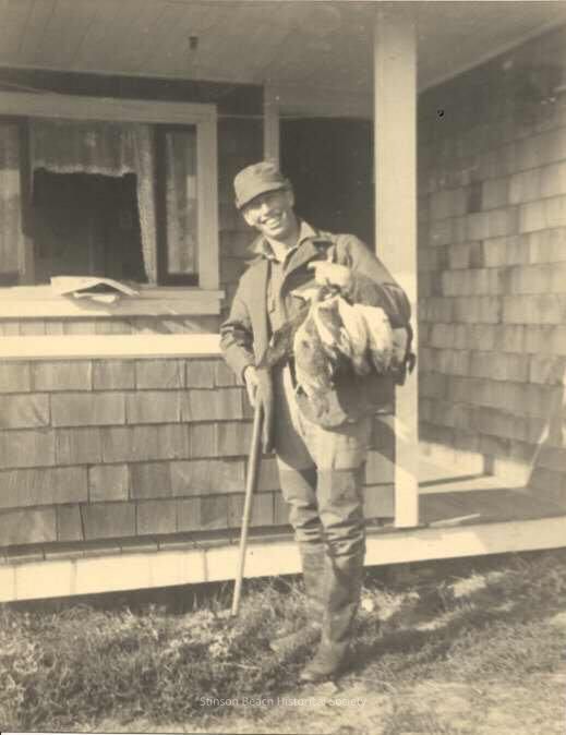 "Pop" Stelling, a smiling middle-aged man, stands in front of a wood shake porch of a house holding his catch of the day (which looks more like rabbit than fish or bird but could be both). In the other hand he holds a long pole-shaped thing, which looks too narrow to be a rifle but... it must have something to do with his catch. He is wearing a fisherman's cap, thigh high rubber boots, and jacket over an open collar shirt. The house he's standing in front of has a window with a lace curtain and a book or newspaper resting on the sill. The house is slightly elevated above the grassy ground.Collection