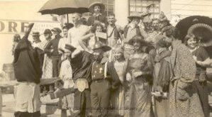 This black and white photograph is of a crowd of upwards of twenty people, many in costume standing on the steps of Airey's Store. In the middle a woman is seen (Ruth Miller) holding a piece of paper in her teeth. There is an open umbrella in the upper left corner, an open Japanese style parasol on the upper right corner and a man dressed as a fireman in the middle of the front row. The last three letters of Airey's Store are visible behind the people in the upper left corner.Collection