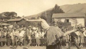 This black and white photograph shows a crowd behind a roped off area watching the performance of a man in a clown suit and a lady (Ruth Miller) in a grass skirt. He is facing the camera and holding her aloft. She is in a flying position with arms and legs outstretched facing left.Collection