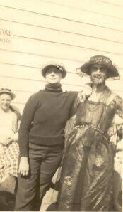 In this black and white photograph a man and a woman pose against the white wall of Airey's store. She is dressed as a boy in trousers, turtleneck sweater and a newsboy cap. He is dressed as a woman in a hat with a veil and an elegant dress with a filmy net scarf. His beard is clearly visible and appears to have been waxed and accentuated. Behind them to the left, sitting on the bench, another man dressed as a woman in a straw hat and gingham dress.Collection