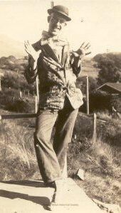 In this black and white photograph a man poses in pants that come to above his ankle bone, a print jacket, a giant oversize bow tie and a tiny Tyrolean type hat with a feather sticking out. His stance is showy with one leg crossed in front of the other and his thumbs under his lapels. He is on a platform with grassy hills in the background.Collection