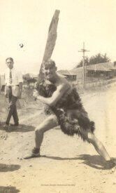 In this black and white photograph a man dressed in furry skins stands in a threatening stance with a huge cudgel raised over his right shoulder, ready to strike.Collection