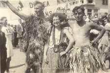 A woman with dark curly hair and glasses (Ruth Miller) stands between two men. She is wearing a grass skirt (as is the man on the right only his skirt seems to be made out of ties or various other materials) and a couple of plastic leis. The other man has one arm raised as if waving to someone and is covered in something that looks furry. There is a crowd of people behind them and a banner with DIPSEA partially visible as well as a building on which can be read STORE.Collection