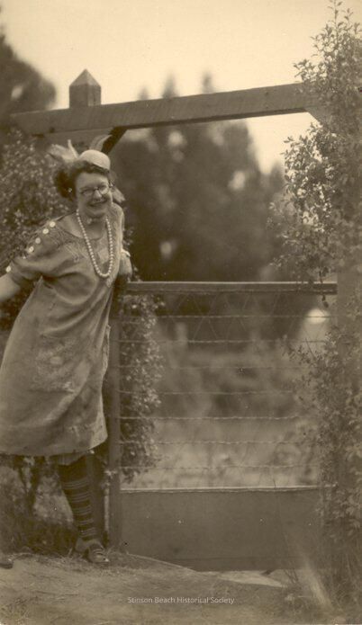 This is a black and white photograph of a young woman standing by a gate. She is Ruth Miller. She is wearing an odd get up, possibly a costume, consisting of a little bowl of a hat with feathers sticking out, perched jauntily on her hair, a string of beads over a loose fitting dress with stitchery and striped knee socks. She wears glasses and is smiling at the camera.Collection