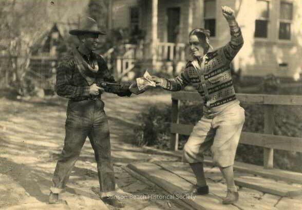 In this black and white photograph, a man in a cowboy outfit and hat is on the left. He is pointing a gun at the man on the right who is handing over paper bills and holding up his left arm. This man is wearing a cardigan sweater and knickers. They are acting out a holdup and laughing. They are on a wood bridge. A white house with front porch is in the background.Collection