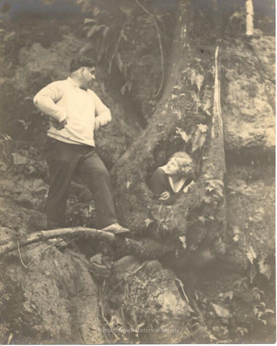 The same heavy-set man in previous photo has been joined by a fair-haired woman who leans in the cleft of the tree where he had been standing and looks up to him. He is standing, looking down at her with his arms akimbo and one foot resting on a horizontal branch branchCollection