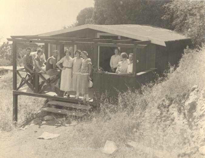 On the open porch of a small one-level house nestled against a scrubby hillside with bushy trees behind it, is a group of youngish men and women. On the left two men with a woman between them sit on the porch railing. In the center where a couple wooden steps lead down to a dirt pathway stand 3 women in dresses with their arms around each other. Behind them and to the right stands a woman in the doorway to the house. In the right corner of the porch, which is semi-enclosed to railing height, stand a couple with their arms around each other. She (Ruth Miller?) is looking towards the other folks while he smiles at the camera. Everyone else is looking at the camera.Collection