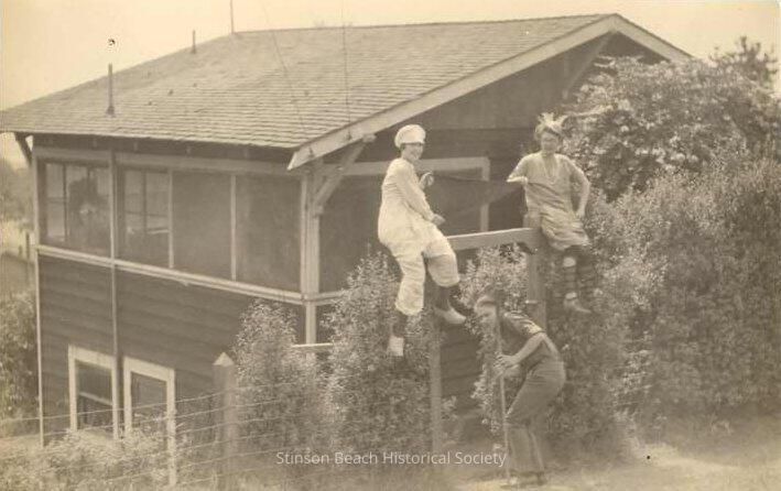 The women (or maybe 2 women and a young man) seem to be working on a wood and wire fence beside a two-story house. The two women (Ruth Miller? on the right) are sitting on the high part of the fence, which may be an entrance, and each has hold of a piece of dark fabric (awning?) stretched out between them. The third person is standing, hunched over and holding a hoe or mallet, at the "entryway." The house behind them has wraparound screened windows on 3 sides upstairs. Double windows can be seen on the lower portion of the house. Noted on the back of photo in pencil "Miller Buena Vista."Collection