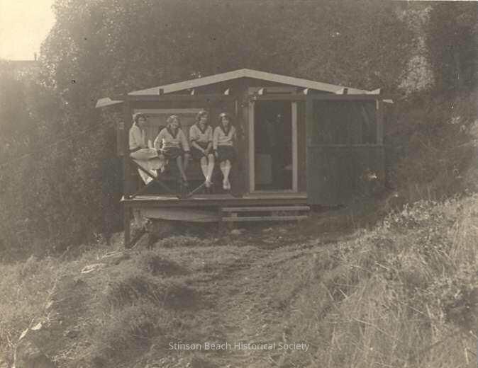 Four woman sit on the railing of a wooden cabin set against the hillside. All the women are dressed similarly in white v-neck tops, which are trimmed in or over something dark, and dark skirts, except the woman sitting on the far left whose skirt is white. Two of the women are wearing white knee socks. Their legs, crossed at the ankles, are dangling over the railing. The cabin door is open - or maybe it has no door - and furnishings are barely visible inside. The cabin is nestled in a clearing in front of some bushy growth. A dirt pathway leads up to it.Collection