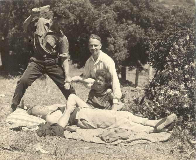 On a garden lawn are 4 people enacting a murder by death scene. One man lies on his back on the ground - actually on a blanket and pillow on the ground beside a flowering shrub. Over him stands a man in shirtsleeves with a cigarette between his lips holding a glass bottle threateningly over him. With his other hand he has hold of a woman's wrist who is on the ground next to the "corpse" trying to escape the clutches of a 4th man who is holding her back with one hand around her neck and the other on her arm. He is kneeling and smiling at the camera. The woman is Ruth Miller.Collection