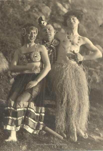 Three men in exotic costumes pose for the camera. The seated man in the midddle with a tiny clown cap set on his head has a "lady" on each knee. The one on the right is barechested with a grass skirt and a string necklace. The one on the left has a middle eastern look with matching beaded head and chestbands and sheer skirt, striped at the bottom.Collection