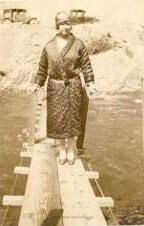 A woman in a satiny overcoat and matching head scarf or hat stands on a wooden trestle facing the camera. Her hands are resting on two verticle support beams on either side of her. There appears to be water beneath the trestle. On the far side behind her, up a rocky embankment, two vintage autos are parked.Collection