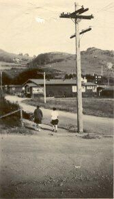 Stinson Beach intersection in the year 1928, as identified on the back of the photo. A large telephone pole dominates the near landscape as two female figures pass beneath it, walking towards a long, low building (old Chinese market?) with a roadsign in front. The hillside rises up beyond.Collection