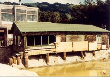 This color photographic print is of a single story shingled house on log pilings with a large pool of water in front of it. The end of the house on the left side of the picture appears to be a sort of porch with four window frames but no glass in them. The lower portion of the porch is of very battered wood with no shingles visible. There is plywood nailed across a large window in the center of the house and plywood nailed across the whole lower portion of the house beyond the porch. A tall house with three large windows is visible behind.