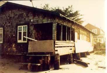 This color photographic print is of a single story shingled beach house. The picture is of the corner of the house with the long side going to the right and the end on the left. The house is on log pilings. There are steps leading up to the entry, which is a porch, at the corner of the building. The steps are make shift boards across the stair frame which has had its treads washed away. There is a plywood board across the entry at the top of the steps. The side of the porch is bare boards and plywood with no shingles visible. The side of the house proper has plywood nailed along its lower portion and over its windows. About 2 feet of pilings are exposed above the sand. See notes.Collection