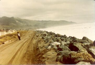 The view is toward the south, in the vicinity of 178 Seadrift Road. One person stands in a "road" that was created by front loaders, which placed rip rap rock along the top edge of the dunes to the eroded beach below to protect the houses from the incoming ocean and prevent further erosion of the dunes. Note the stormy seas, white with foam.Collection