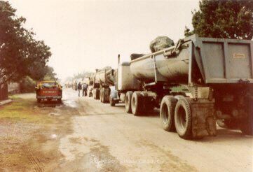A red pickup truck is parked on the left side of Seadrift Road, near #178. On the right side is parked a convoy of trucks carrying rip rap waiting their turn to dump their load. Rocks had to be dumped on the road. A "front loader" then carried the rock across a vacant lot and deposited them on the beach to create a seawall. The process took 3 months.Collection