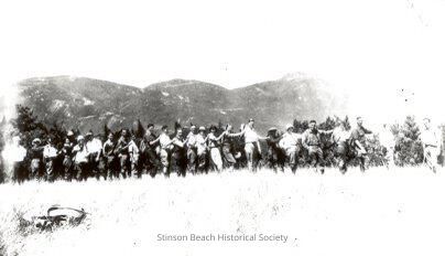 Members of the Contra Costa Hill Hiking Club stand single file, stretched out along the landscape. Most are standing with one hand on the shoulder of the person in front of them, a few had one leg extended in the air. On the back of the original photo is written "Lone Tree," a trail on Mt. Tamalpais.Collection