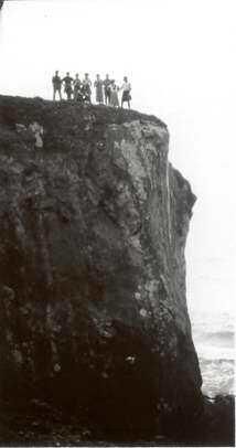 A group of 8 or 9 hikers stand along the top of a steep and rocky outcropping, which is possibly part of the Dipsea Trail, overlooking the Pacific Ocean and Bolinas Bay. Hikers include Margaret King (Clark) of Berkeley and members of the Contra Costa Hills Hiking Club, although no one is identifiable in the photo since the people are about the size of toothpicks in the photo. Churning ocean waves are visible at the base of the drop-off.Collection