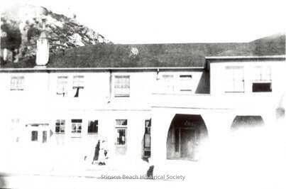 The Summit Inn on Mount Tamalpais, which burned down in 1923. In a very overexposed photo all that is visible is a long linear 2-story building with windows grouped in pairs and what appears to be an arched entryway on the right towards which a woman in walking.Collection