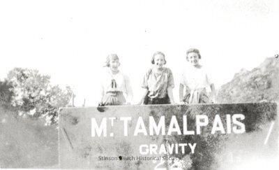 Three young ladies stand in a gravity car, which is an open railcar that was pulled up the mountain by train from Mill Valley and then coasted back down to Mill Valley or Muir Woods at approx. 12 mph. The ladies/girls are casually dressed in short sleeve outfits. One has a bandana over her hair. They are all smiling at the camera. The railcar that looks like a steel box reads "Mt. Tamalpais, Gavity, 22" on the side.Collection