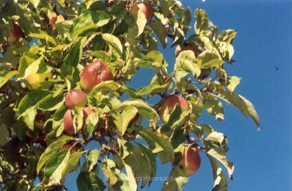 This color photo looks up at the branch of an apple tree, laden with red apples, with deep blue sky behind it. The tree is one of the original plants left at Stinson Ranch.Collection