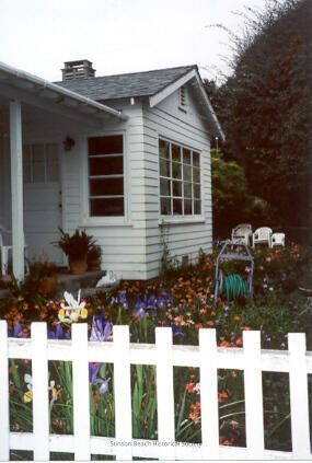 This color photograph is of the entry to a house with paned windows and white siding. It looks over a white picket fence to a garden filled with orange flowers and purple iris. There is a hose caddy beside tha house and some white lawn furniture behind. see notes.Collection