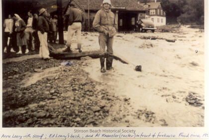 Water rushes down the street in front of the SB Fire Department building. A man (identified on photo as Al Kranzler) in high boots, safari jacket and rain hat stands ankle deep at the edge of the water with his hands in his pockets looking at camera. A group of people behind him on the left are milling around on the gravel. The woman in the white head scarf is identified as Anne Leary. Ed Leary, with his back to the camera, is standing on some sort of broken wood or concrete. The firehouse is in the background. A sedan is parked above the waterline beside it. Further on is a 2-story home, first story painted white, upper floor dark wood.Collection