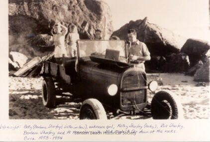 Photo caption reads - L to R: Betty (Barbara Sherfey's sister-in-law), unknown girl, Kathy Sherfey (baby), Bill Sherfey, Barbara Sherfey and Al Kranzler with 29A Model A car down at the rocks. Circa 1953-1954. The children appear to be standing in the rear of the Model A and the baby is barely visible through the windshield. The adults stand on the far side of the auto, with Al being the most visible towards the front. The Model A is parked on the sand near the base of a large boulder outcrop.Collection