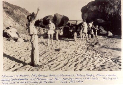Photo caption reads - "Left to right: Al Kranzler, Betty (Barbara Sherfey's sister-in-law), Barbara Sherfey, Eleanor Kranzler, Scott Kranzler and Bruce Kranzler down at the rocks. The line was being used to get electricity to the radio. Circa 1953-1954." Al has his arm raised, holding the electrical line. The other people are busy among themselves, standing beside the Model A, which is parked on the sand between the rocky outcrops on the beach.Collection