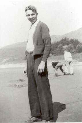 A man in long trousers, light shirt and cardigan sweater standing on the beach with his arms at his side. He is facing the camera and smiling though his body is turned slightly away. Behind him two men playing football are visible (one hunched over, the other behind him to receive the ball).Collection