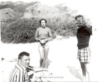 Two women and one man on Stinson Beach dunes. On left man is casually sitting on the sand. He is wearing a striped shirt. In the center a woman stands wearing a cardigan over her swimsuit. She has a small white object in her hand. On the right a second woman in plaid shorts and dark sweater looks toward her. Scrub brush is behind them. Hillside in background.Collection