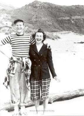 A very happy, smiling couple stand with an arm around each other facing the camera. He is wearing a striped t-shirt, rolled up dungarees and a plaid shirt tied around his waist. Also a cap and tennis shoes witih sox. She has on plaid pedal pushers and a dark blazer and seems to be barefoot. They're standing in front of a long log of driftwood. Dunes and rough hillside behind them. A beach house or 2 behind them on left.Collection