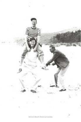 Three men on the beach. One man stands bow-legged with another man on his shoulders. The third man seems to be ready to take a whack on his behind. Photo pretty washed out but dunes with hills behind can be seen all along beachfront.Collection