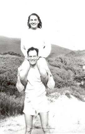 In this black and white photo a man stands smiling at the camera with a woman astride his shoulders. She is also smiling at the camera. Both are wearing shourts and long sleeve sweat shirts. The photo is from his knees up. He is standing on a dune. There is shrubbery growing on top of the dune and a hillside in the background.Collection