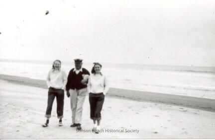 An older gentleman with nautical cap walks between two younger girls in jeans and long sleeve shirts. The surf is behind them and they are walking away from it. The picture is blurry but the day seems foggy. He is carrying something under one arm. Can you guess what it is?Collection
