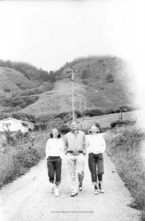 In this black and white photograph a man flanked by two women walk donw a dirt road toward the camera. The man is wearing light trousers and a shirt. The women are dressed similarly in rolled up jeans and white sweat shirts. Behind them to the left is a white cottage and there is a telephone pole directly behind the man, appearing to be growing out of his head. The hills of Stinsoj Beach are in the background.Collection