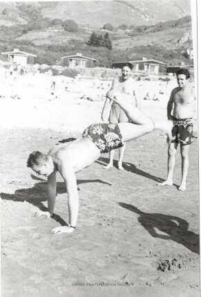 In this black and white photo a man stands on his hands on the sand. His body is almost horizontal with one leg stretched out behind him and the other bent at the knee as if he is either on his way up into or on his way down from a hand stand. Two men stand behind him, watching, and they appear to be laughing as well. Behind them on the dunes are three cottages (Seadowns) with hills rising in the background.Collection