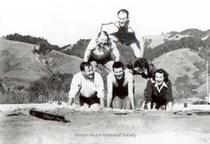 Black and white photo similar to 2000-142 with fewer people in the pyramid. Only 6 people - 3 on the bottom, 2 in the middle and one man on the top - and they look like they might be ready to collapse as the middle person on the right does not have his/her arms extended and the man on top is a bit tilted. The two women (one on the bottom and one in the middle) are also laughing heartily. The hills remain in the background.Collection