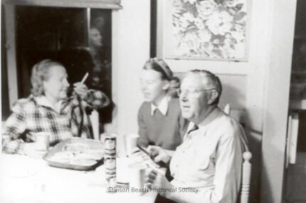 This black and white photograph is a little bit blurry. There is a woman on the right in a plaid shirt holding a cigarette in a cigarette holder. She is smiling and looking at the woman next to her, to the right. On the far right a man wearing glasses is seated in profile to the camera. They are all seated around a table. The man holds an oyster knife and although what is in front of him is obscured by a tumbler and three juice cans piled one on top of the other, there is a pan of opened oysters on the half shell sitting in front of the two women. The woman with the cigarette holder is Ruth, grandmother, the woman next to her is Bobbie, mother, and the man is Warren, grandfather of Jim Fischer.Collection