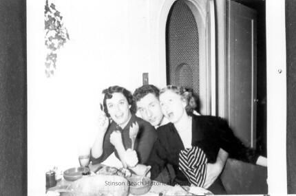 In this black and white photograph two women and a man pose behind a table on which are some bowls and other dishes and a pepper mill. The woman on the left is holding a fork up beside her head. The woman on the right, wearing a black dress with a striped bow at the bosom, holds a large salad fork in front of her with her other arm extended to the side. Her mouth is open and she appears to be singing. The man peers out from behind and between the two women with his arm around the 'singer'.Collection