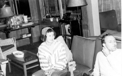 In this black and white photo a young woman sits on the edge of a chair with a ukulele lying on the seat beside her. She is wearing a loose blouse with broad stripes and a knitted cap with fuzzy earmuffs atached to it. There is a man to her left, in the right lower corner of the picture, who is scratching or pulling on his right ear. Both subjects are looking away from the camera to their left, possibly at the man whose reflection can be seen in the window in the left upper corner of the photo. There is a lot of furniture behind the subjects including (going in a clockwise direction from the woman) a coffee table with and ashtray on it, a wicker chair, a table with a lamp, two photographs in a double frame, some flat books and a glass or vase on top and some books lying flat on a shelf under the table, a window sill with some potted plants, a cabinet full of old LP records and a standing lamp.Collection