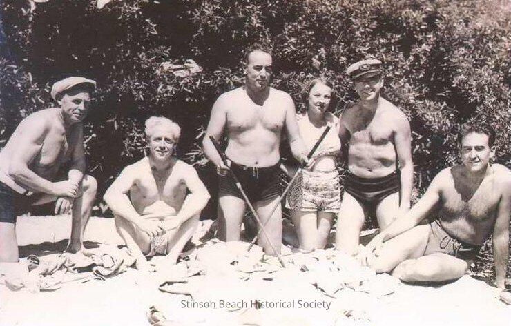 Group of 6 people on the beach in front of willow bush. The man in the center holds two walking sticks indicating they got there by hiking. All were wearing swimming clothes, other items of clothing are laying in front of them.On the back of photo: 1. Dr. Newman, 2. Duke Griffin, 3. Charles O'Brien, 4. Irene Griffin, 5. Lloyd Roach, 6. Elmer Collett are listed. Names are from left to right. Dr. Newman and Lloyd Roach's names can be found among the town fathers in 1940s.